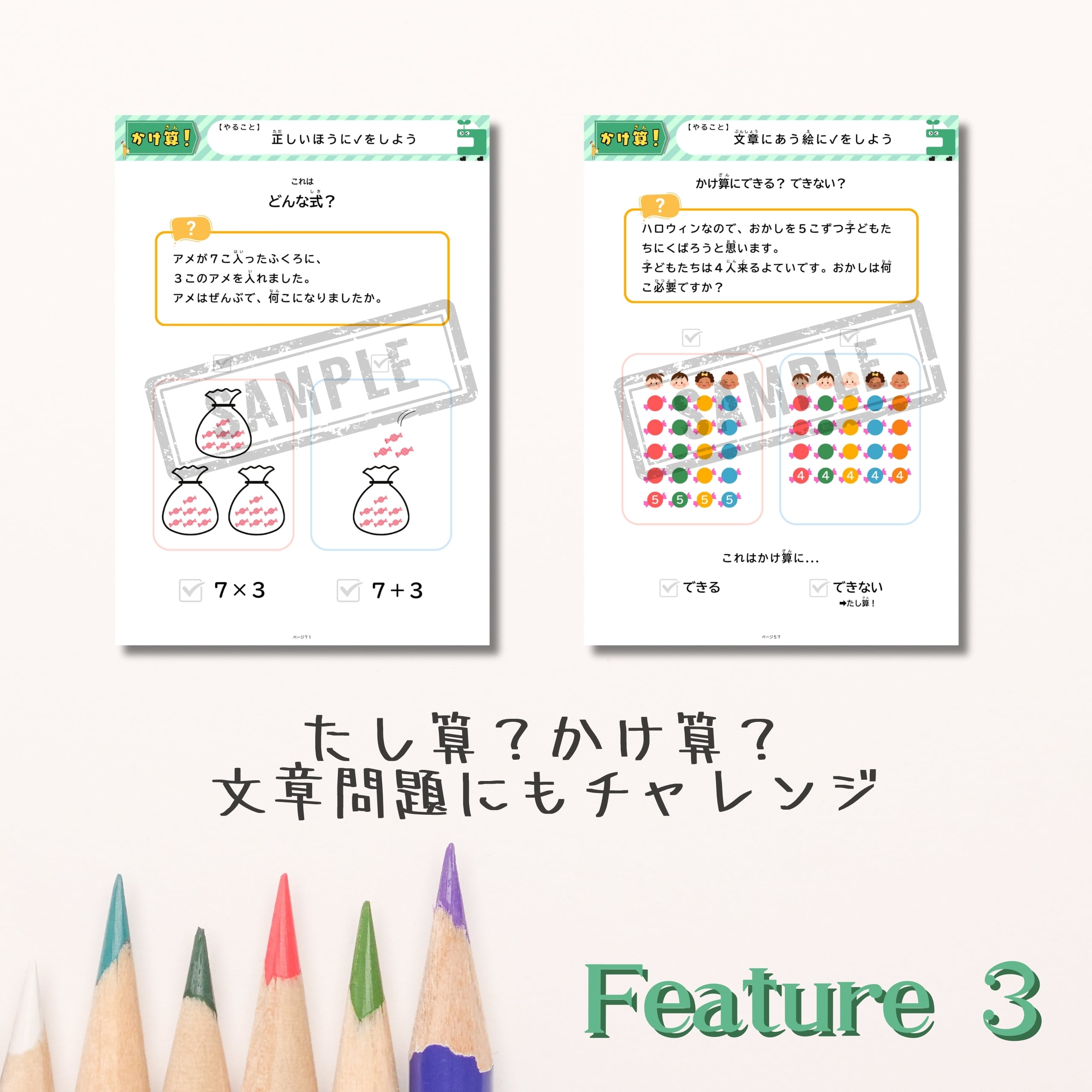 このドリルは「かけ算とは何か」を数量感覚をもってわかりやすく学ぶことができ、式の意味がつかめるようになります。