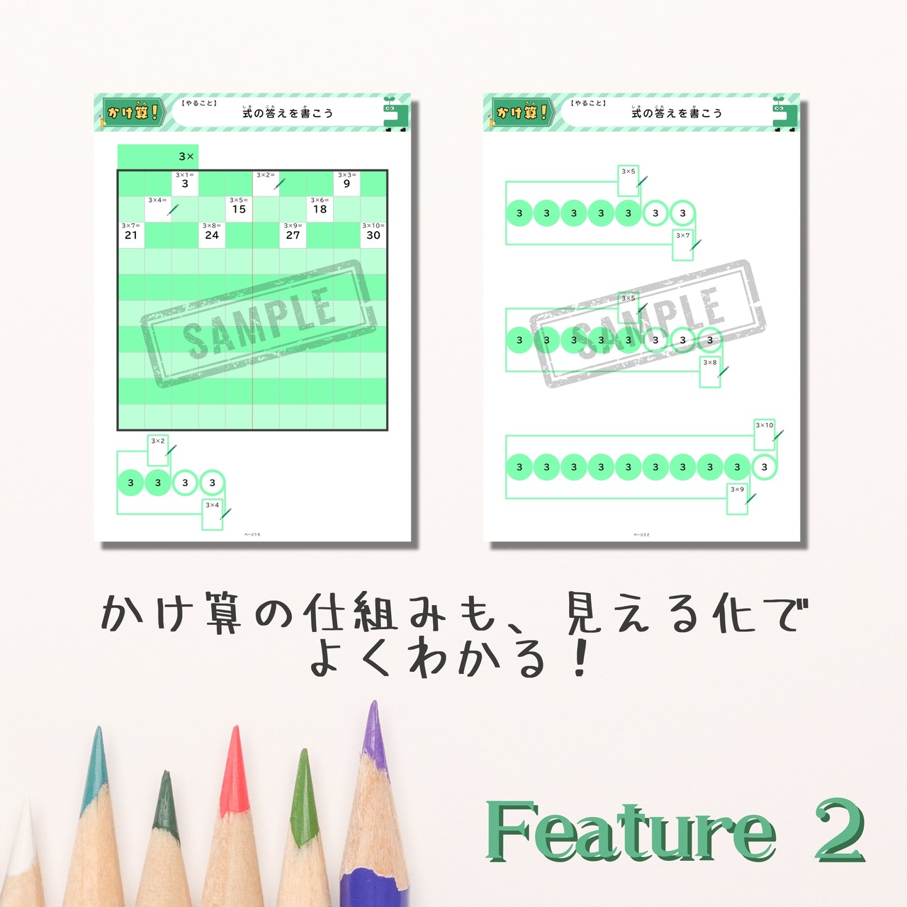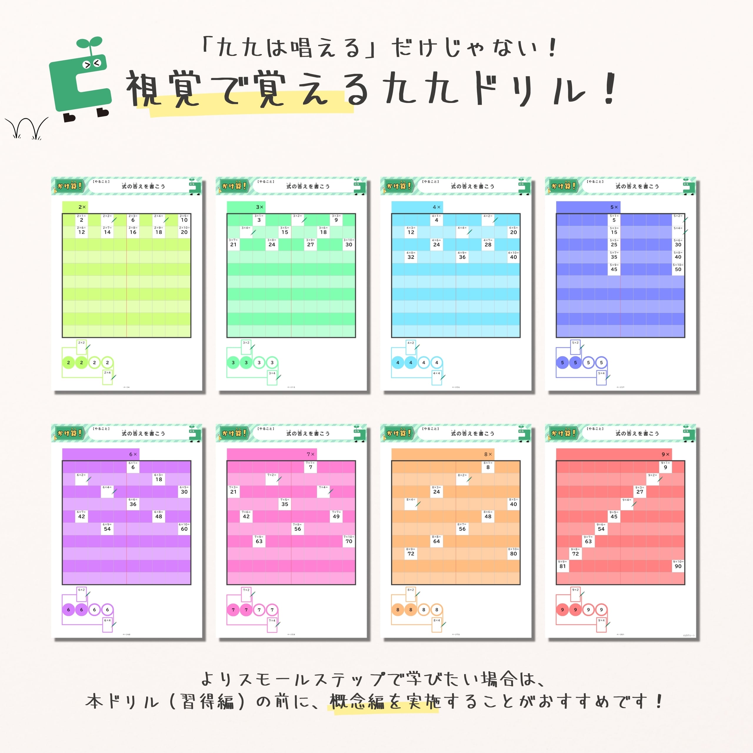 このドリルは「かけ算の仕組み」を数量感覚をもってわかりやすく学ぶことができ、式の意味がつかめるようになります。