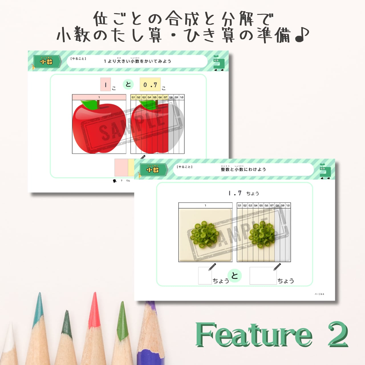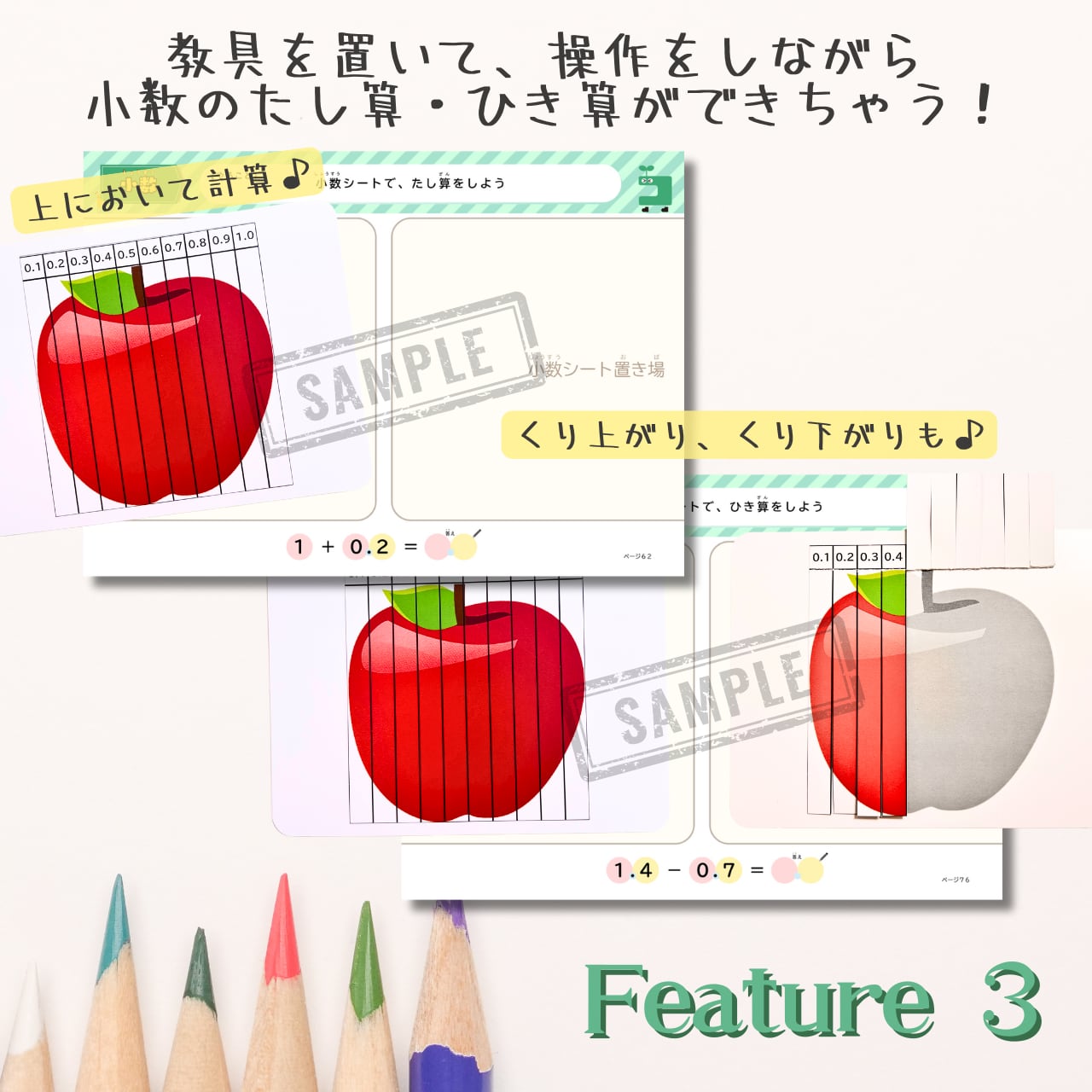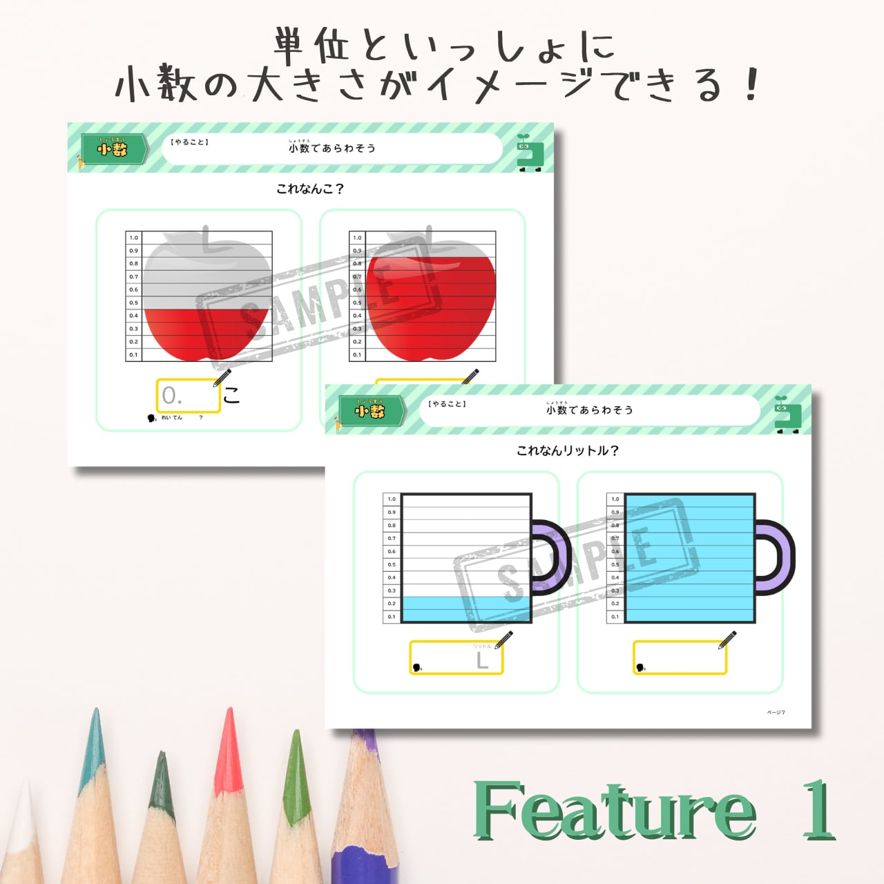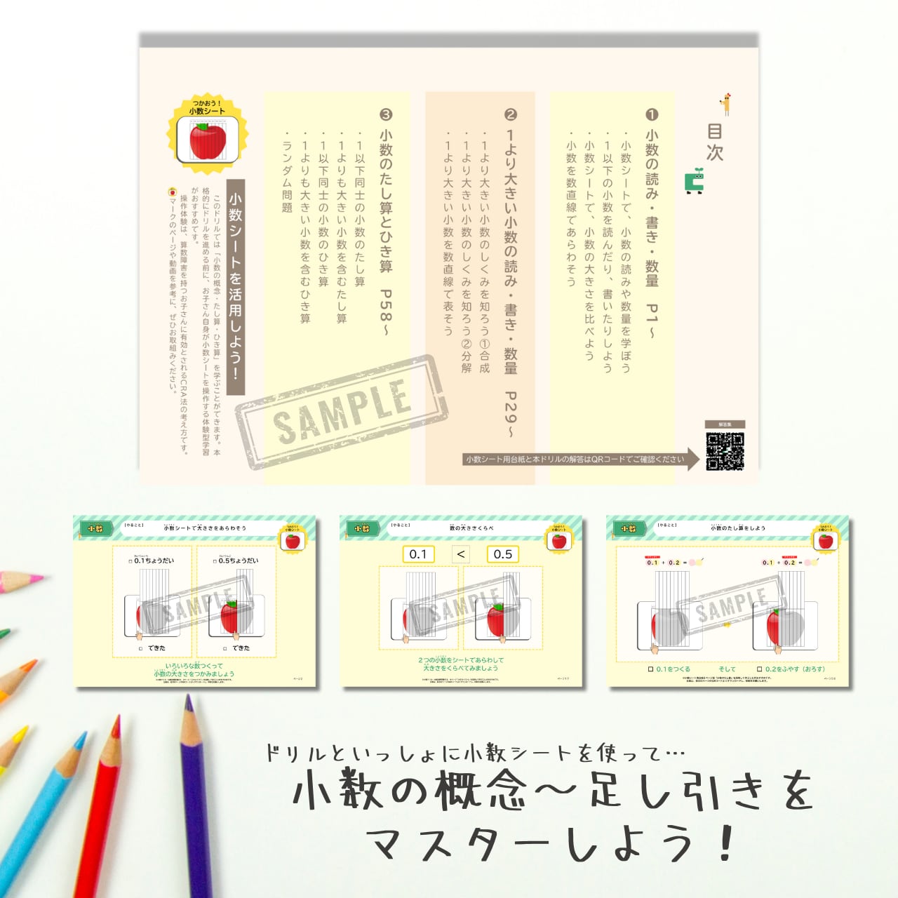 そんな声にこたえて、小数シート対応、概念理解からたし算、ひき算もできちゃう小数ドリルが登場です!
