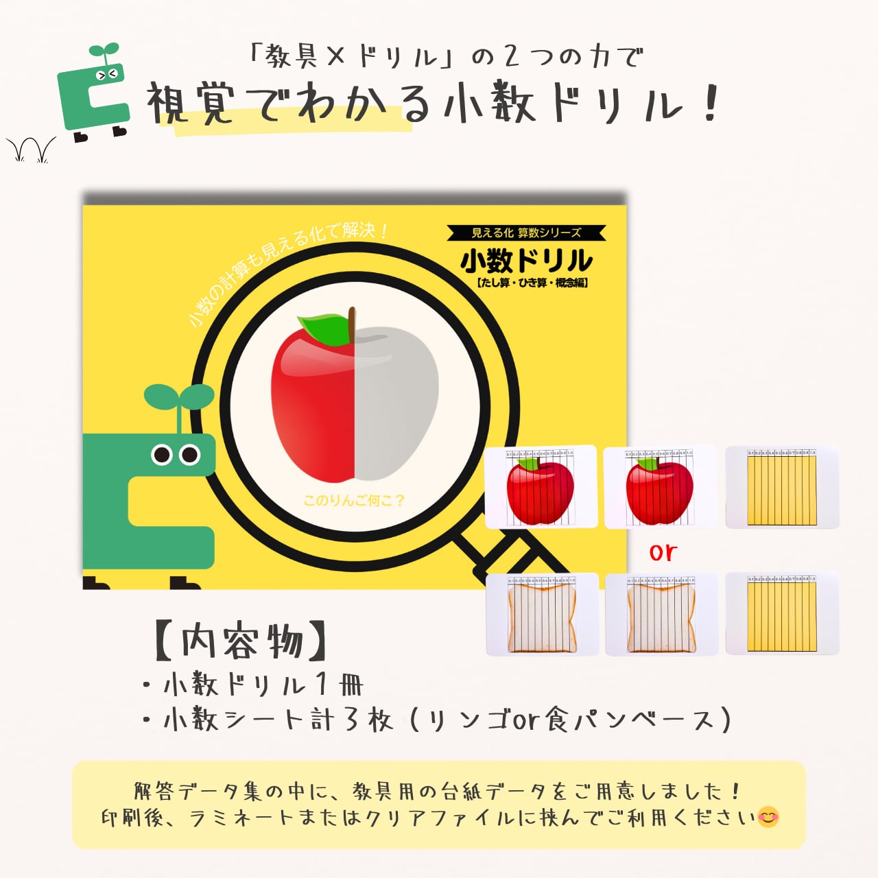 ②小数シート3枚(りんご2枚+黄色1枚 or 食パン2枚+黄色1枚)